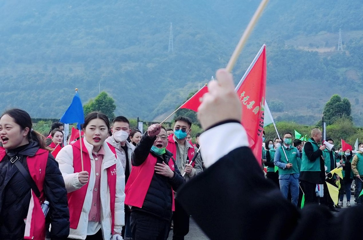 新年徒步活動(dòng)于海花溝溝口出發(fā),200余人的徒步隊(duì)伍彩旗招展,整裝待發(fā)。